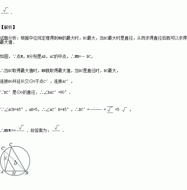 如图,AB是⊙O的弦,AB=5,点C是⊙O上的一个动点,且∠ACB=45°,若点M、N分别是AB、AC的中点,则MN长的最大值是 .