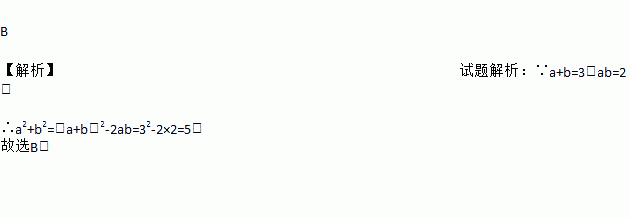 B 【解析】试题解析:∵a+b=3,ab=2, ∴a2+b2=(a+b)2-2ab=32-2×2=5. 故选B.