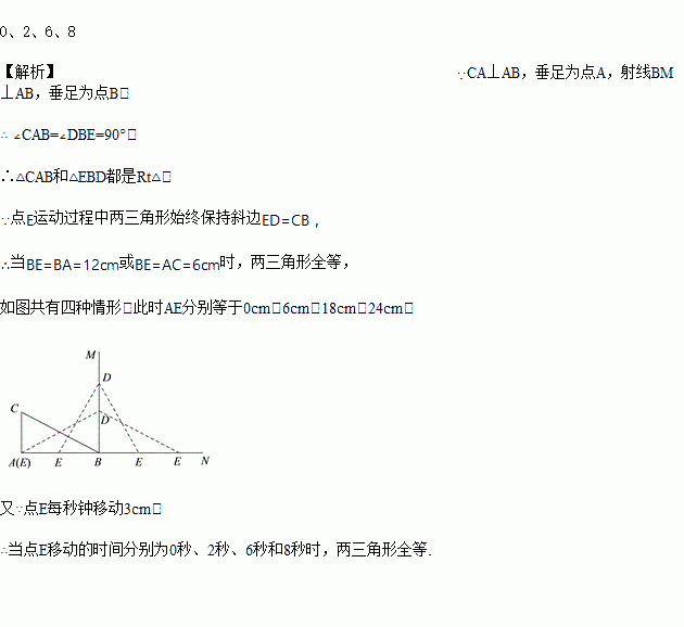 如图,CA⊥AB,垂足为点A,射线BM⊥AB,垂足为点B,AB=12cm,AC=6cm.动点E从A点出发以3cm/s沿射线AN运动,动点D在射线BM上,随着E点运动而运动,始终保持ED=CB.当点E经过______s时,△DEB与△BCA全等.