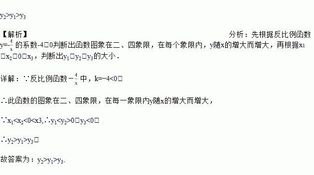 已知(x1,y1)(x2,y2)(x3,y3)是反比例函数y=-的图像上的三个点,且x1<x2<0<x3,则y1、y2、y3的大小关系是______(用“>”连接).