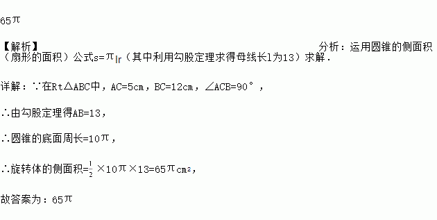 如图,在Rt△ABC中,AC=5cm,BC=12cm,∠ACB=90°,把Rt△ABC绕BC所在的直线旋转一周得到一个几何体,则这个几何体的侧面积为_____cm2.