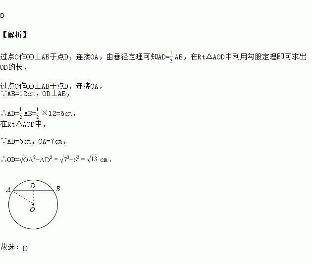 如图,已知☉O的半径为7,弦AB的长为12,则圆心O到AB的距离为( )