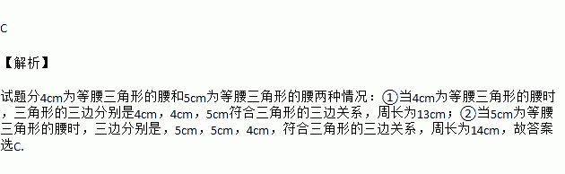 一个等腰三角形一边长为4cm,另一边长为5cm,那么这个等腰三角形的周长是( )