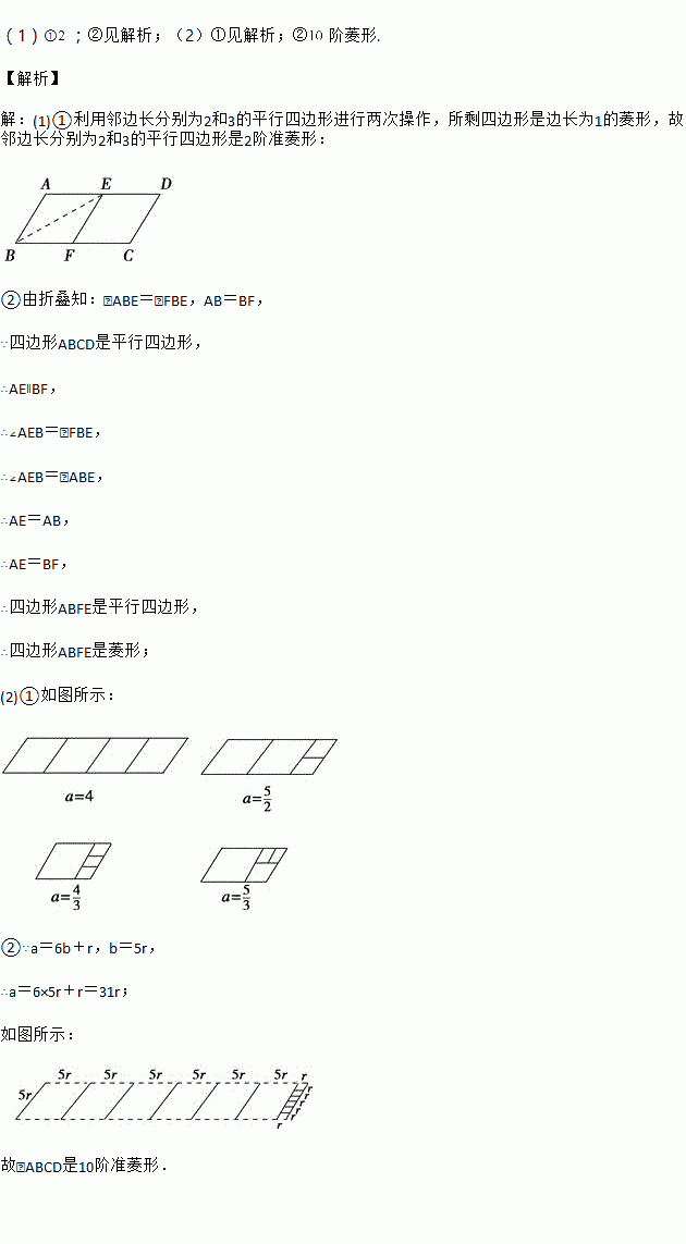 邻边不相等的平行四边形纸片,剪去一个菱形,余下一个四边形,称为第一次操作;在余下的四边形纸片中再剪去一个菱形,又剩下一个四边形,称为第二次操作;…依此类推,若第次操作余下的四边形是菱形,则称原平行四边形为![]()