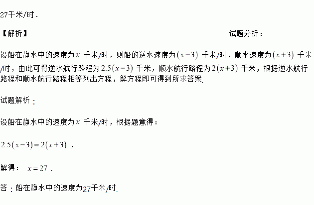 27千米/时. 【解析】试题分析: 设船在静水中的速度为千米/时,则船的逆水速度为千米/时,顺水速度为千米/时,由此可得逆水航行路程为千米,顺水航行路程为千米,根据逆水航行路程和顺水航行路程相等列出方程,解方程即可得到所求答案. 试题解析: 设船在静水中的速度为千米/时,根据题意得: , 解得: . 答:船在静水中的速度为27千米/时.