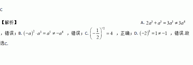 A. 2a3+a3=3a6 B. (﹣a)2•a3=﹣a6 C. (﹣)﹣2=4 D. (﹣2)0=﹣1