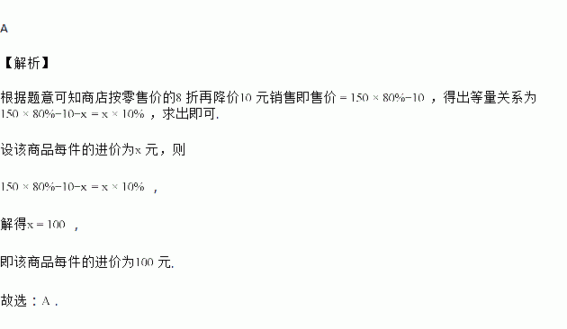 某商品每件标价为150元,若按标价打8折后,再降价10元销售,仍获利10%,则该商品每件的进价为( )