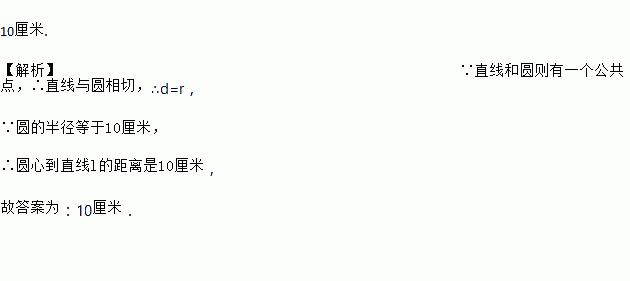 10厘米. 【解析】∵直线和圆则有一个公共点,∴直线与圆相切,∴d=r, ∵圆的半径等于10厘米, ∴圆心到直线l的距离是10厘米, 故答案为:10厘米.