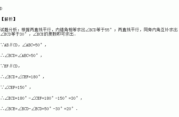 如图,AB∥CD∥EF,若∠ABC=50°,∠CEF=150°,则∠BCE=( )