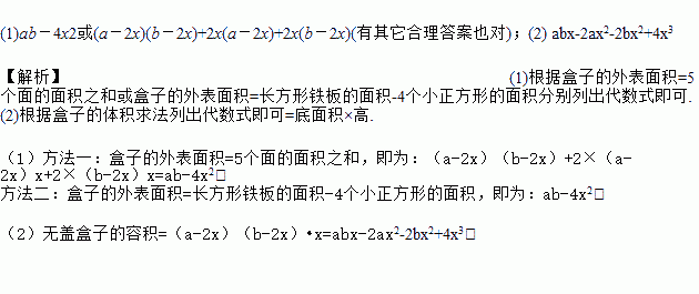一张长为a宽为b的铁板(a>b),从四个角截去四个边长为x的小正方形 ,做成一个无盖的盒子,用代数式表示: