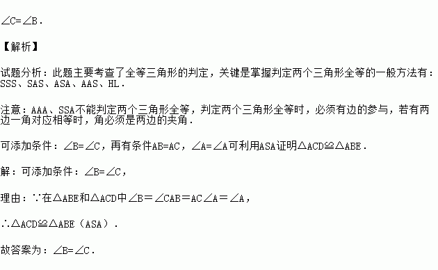 Èçͼ£¬AB=AC£¬ÒªÊ¹¡÷ABE¡Õ¡÷ACD£¬ÒÀ¾ÝASA£¬Ó¦Ìí¼ÓµÄÒ»¸öÌõ¼þÊÇ £®