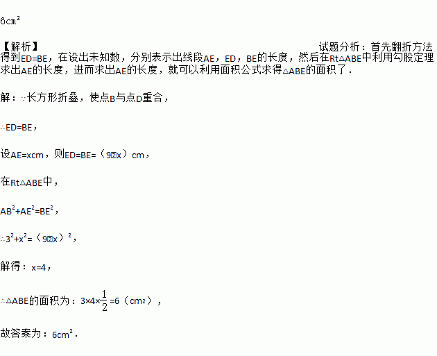 如图,长方形ABCD中,AB=3cm,AD=9cm,将此长方形折叠,使点B与点D重合,折痕为EF.求△ABE的面积.