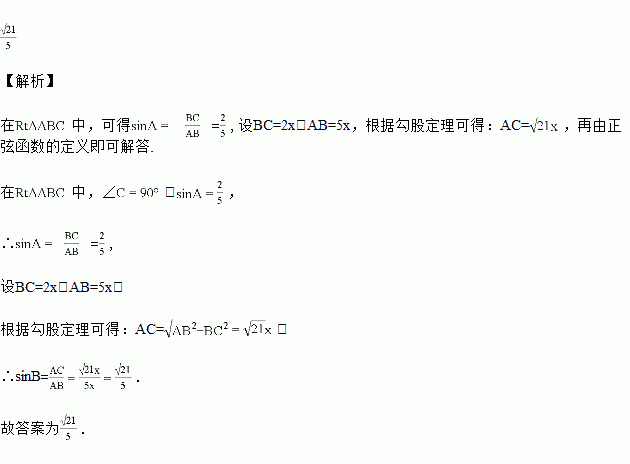 在△ABC中,∠C=90°,,则sinB的值是________.
