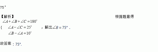 在△ABC中,∠A-∠C=25°,∠B-∠A=10°,则∠B=__________.