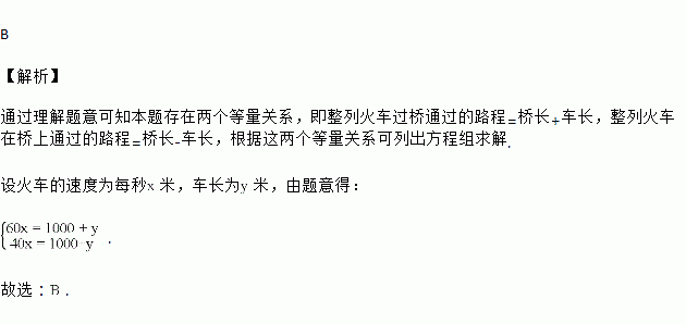 已知某桥长1000米,一列火车从桥上通过,测得火车开始上桥到完全过桥共有1分钟,整列火车在桥上的时间为40秒设火车的速度为每秒x米,车长为y米,所列方程正确的是![]()