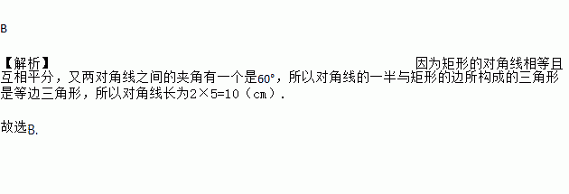 一矩形两对角线之间的夹角有一个是60°,且这角所对的边长5cm,则对角线长为( )