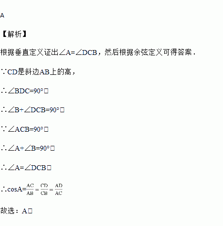 如图,在Rt△ABC中,CD是斜边AB上的高,∠A≠45°,则下列比值中不等于cosA的是( )