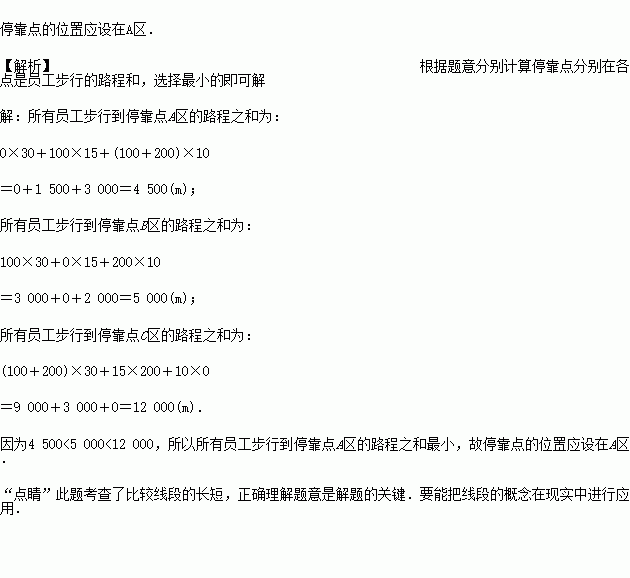 如图所示,某公司员工分别住在A,B,C三个住宅区,A区有30人,B区有15人,C区有10人.三个区在同一条直线上,该公司的接送车打算在此间设一个停靠点,为使所有员工步行到停靠点的路程之和最小,那么停靠点的位置应设在哪个区?