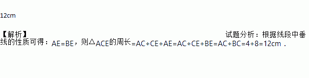 如图,在Rt△ABC中,∠C=90°,AB边的垂直平分线DE交BC于点E,垂足为D,AC=4cm,CB=8cm,△ACE的周长是_____.