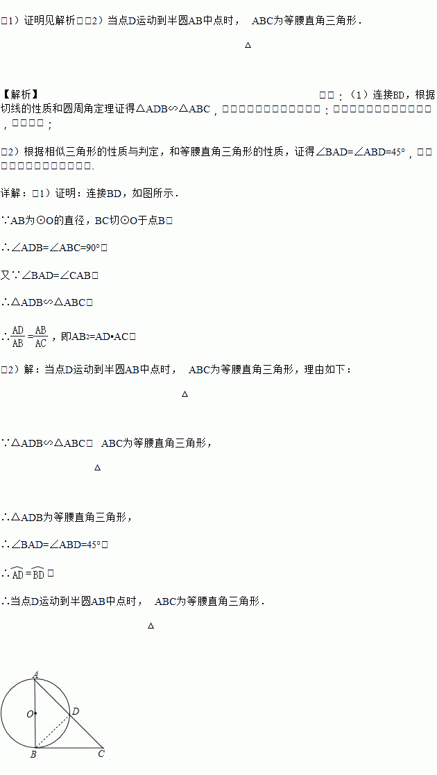(2)当点D运动到半圆AB什么位置时,△ABC为等腰直角三角形,为什么?