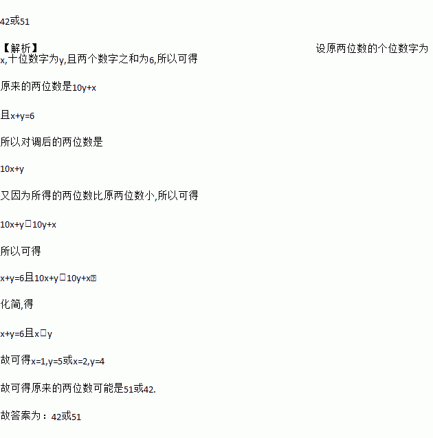 把一个两位数的个位数字与十位数字对调,所得的两位数比原两位数小,且知个位数字与十位数字之和为6,则原来的两位数可能为_____________