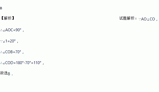 如图,AO⊥CO,直线BD经过O点,且∠1=20°,则∠COD的度数为( )