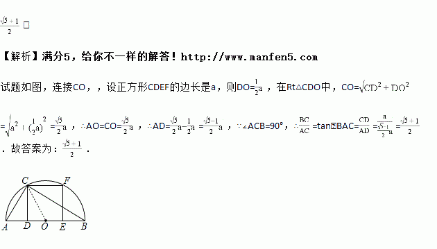 (2016四川省甘孜州)如图,正方形CDEF的顶点D,E在半圆O的直径上,顶点C,F在半圆上,连接AC,BC,则=__.