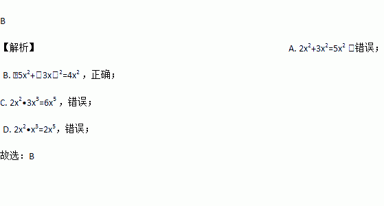 A. 2x2+3x2=5x4 B. ﹣5x2+(3x)2=4x2 C. 2x2•3x3=6x6 D. 2x2•x3=4x5