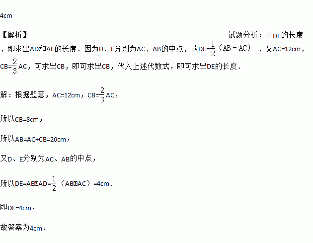 如图,已知点C为线段AB上一点,AC=12cm, CB=AC,D、E分别为AC、AB的中点,求线段DE的长。