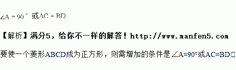 要使一个菱形成为正方形,则需增加的条件是________.(填一个正确的条件即可)