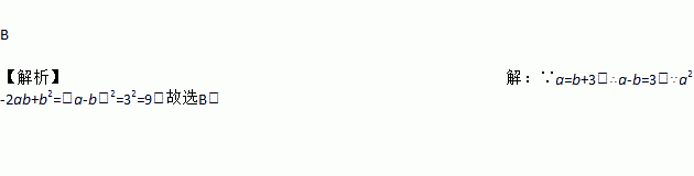 B 【解析】【解析】 ∵a=b+3,∴a-b=3.∵a2-2ab+b2=(a-b)2=32=9.故选B.