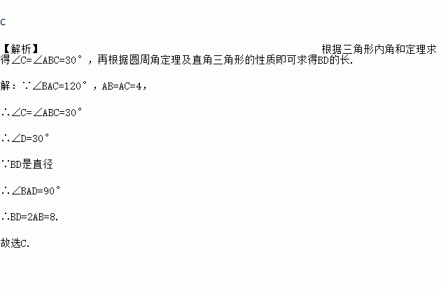 如图,△ABC内接于⊙O,∠BAC=120°,AB=AC=4,BD为⊙O的直径,则BD等于( )