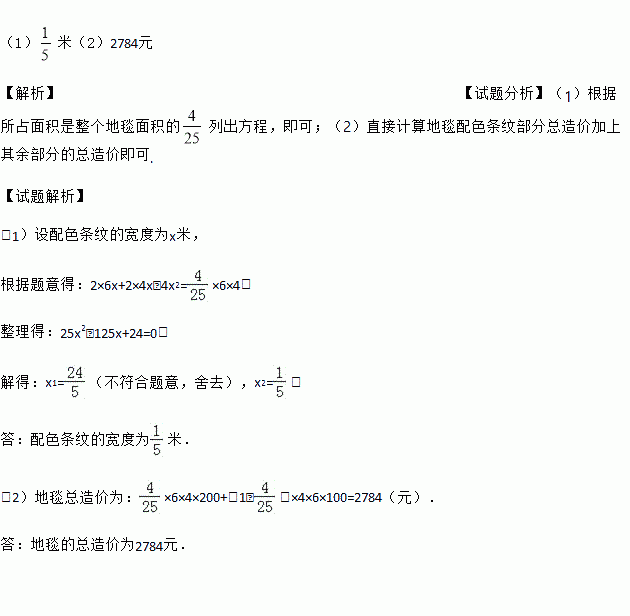(2)如果地毯配色条纹部分每平方米造价200元,其余部分每平方米造价100元,求地毯的总造价.(供参考数据:1052=11025,1152=13225,1252=15625)
