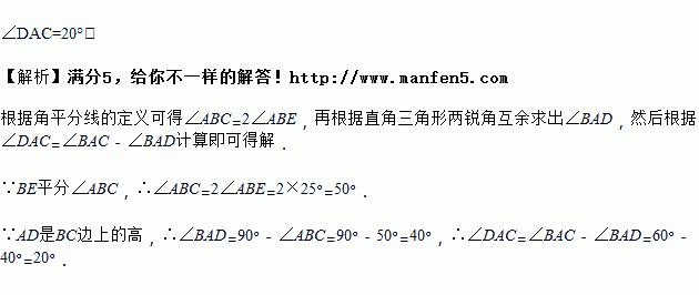 如图,在△ABC中,AD是BC边上的高,BE平分∠ABC交AC边于E,∠BAC=60°,∠ABE=25°.求∠DAC的度数.