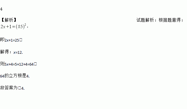 已知2x+1的平方根是±5,则5x+4的立方根是__________.