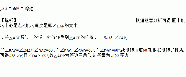 如图,△ABC为等边三角形,D为△ABC内一点,△ABD经过旋转后到达△ACP的位置,(1)旋转中心是______;(2)旋转角度为______;(3)△ADP是_______三角形.