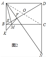 (2)如图2中,连接AC交BD于O.首先证明A、B、M、E四点共圆,再证明△AMC∽△AFD,由此求出DF、BF,再根据△KBF∽△KMA,得$\frac{BK}{KM}$=$\frac{BF}{AM}$=$\frac{\frac{6\sqrt{5}}{5}}{\sqrt{17}}$,设BK=$\frac{6\sqrt{5}}{5}$k,KM=$\sqrt{17}$k,在Rt△KBM中,利用勾股定理即可求出k,解决问题.