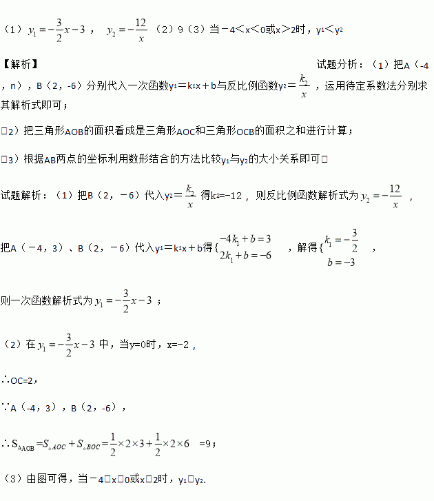 如图,已知A(-4,n)、B(2,-6)是一次函数y1=k1x+b与反比例函数y2=