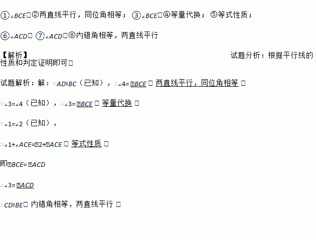 ①∠BCE;②两直线平行,同位角相等; ③∠BCE;④等量代换; ⑤等式性质; ⑥∠ACD; ⑦∠ACD;⑧内错角相等,两直线平行 【解析】试题分析:根据平行线的性质和判定证明即可. 试题解析:【解析】 ∵AD∥BC(已知),∴∠4= ∠BCE ( 两直线平行,同位角相等 ) ∵∠3=∠4(已知),∴∠3= ∠BCE ( 等量代换 ) ∵∠1=∠2(已知), ...
