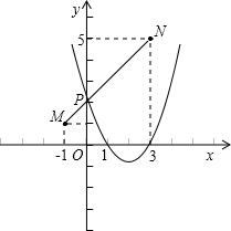 在平面直角坐标系中,点M的坐标为(-1,1),点N的坐标为(3,5),点P为抛物线y=x2-3x+2上的一个动点,当PM+PN之长最短时,点P的坐标是