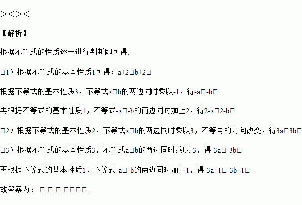(1)a+2____b+2;2-a____2-b;(2)3a____3b;(3)-3a+1____ -3b+1.