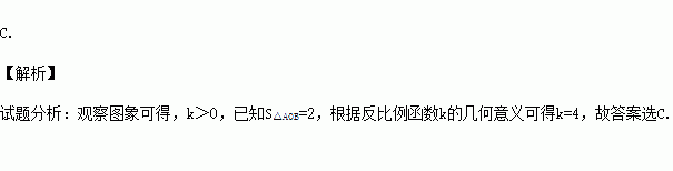 如图,过反比例函数的图像上一点A作AB⊥轴于点B,连接AO,若S△AOB=2,则的值为( )