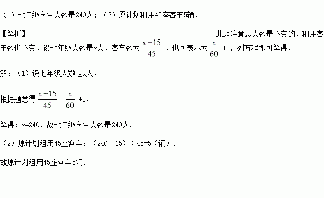 某中学组织七年级学生参观,原计划租用45座客车若干辆,但有15人没有座位;如果租用同样数量的60座客车,则多出一辆,且其余客车恰好坐满.试问: