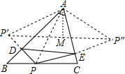 分析:首先作出P关于AB、AC的对称点P′,P″,利用对称的性质得出,△PP′P″形状不变,大小与AP有关,当DE最小时AP最小,当AP为△ABC的高时,AP最小,进而利用勾股定理求出即可.