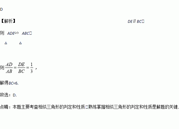 如图,在△ABC中,DE ∥BC,若,DE = 2,则BC的长为( )