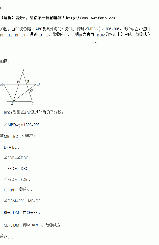 如图,△ABC 中,AB=AC,BD 平分∠ABC 交 AC 于 G,DM//BC 交∠ABC 的外角平分线于 M, 交 AB、AC 于 F、E,下列结论:①MB⊥BD;②FD=FB;③MD=2CE. 其中一定正确的有( )