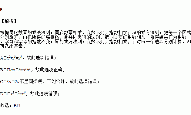A. x2•x3=x6 B. (ab)3=a3b3 C. 3a+2a=5a2 D. (x3)2=x5
