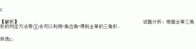 C 【解析】试题分析:根据全等三角形的判定方法带③去可以利用“角边角”得到全等的三角形. 故选C.