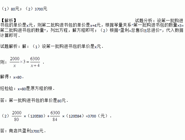 某文化用品商店用2000元购进一批学生书包,面市后发现供不应求,商店又购进第二批同样的书包,所购数量是第一批购进数量的3倍,但单价贵了4元,结果第二批用了6300元。