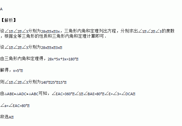 如图所示,△ABE≌△ADC≌△ABC,若∠1∶∠2∶∠3=28∶5∶3,则∠α的度数为( )